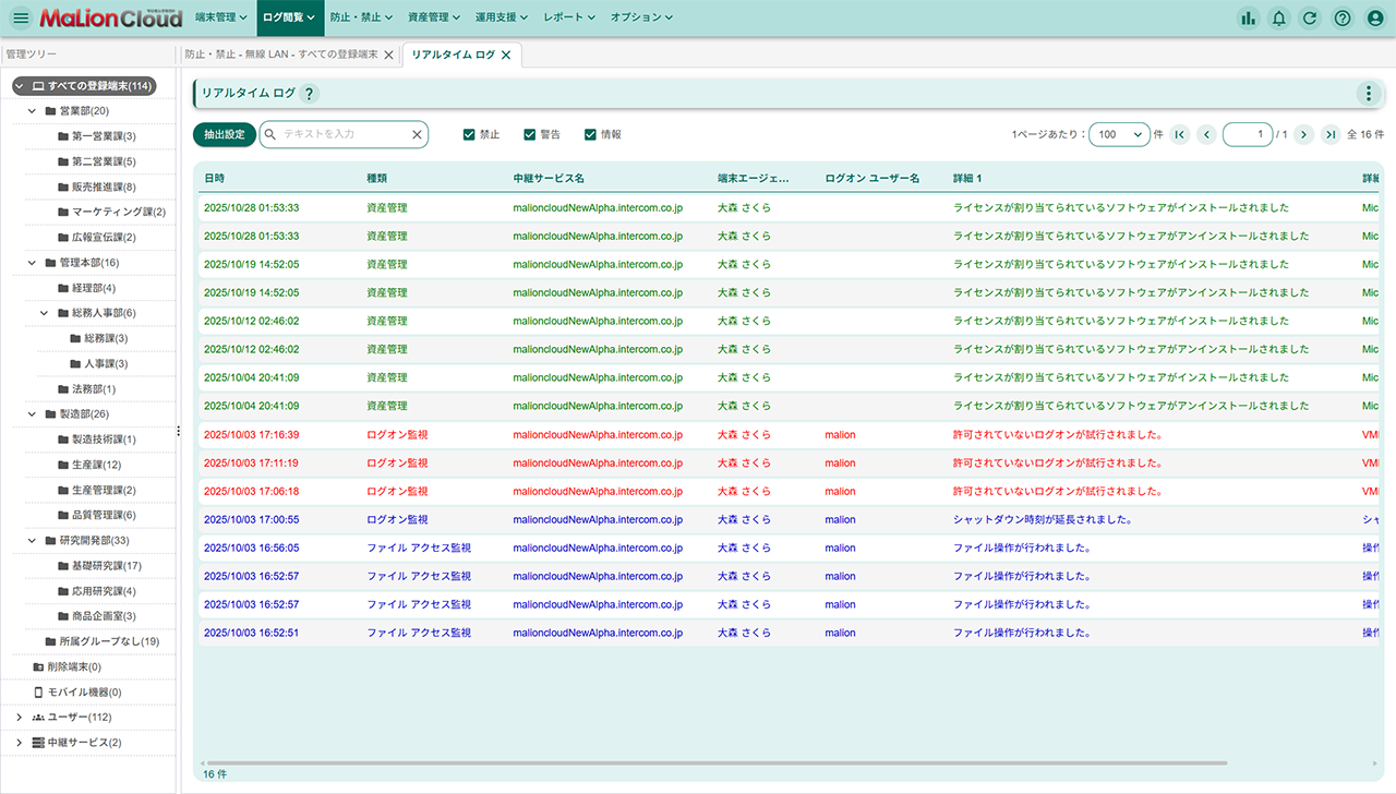 重要警告 管理者通知(リアルタイムログ)
