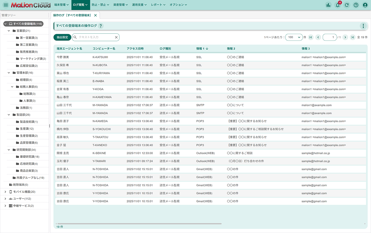電子メールの送受信状況について監視します。Gmail上でのメール送信やメールソフトによるSSLで暗号化されたメールの送受信については、ログの収集のみ行うことができます。収集するログについては、“タイトル+本文”あるいは“タイトル+本文+添付ファイル名”というように収集する情報を細かく設定できます。
