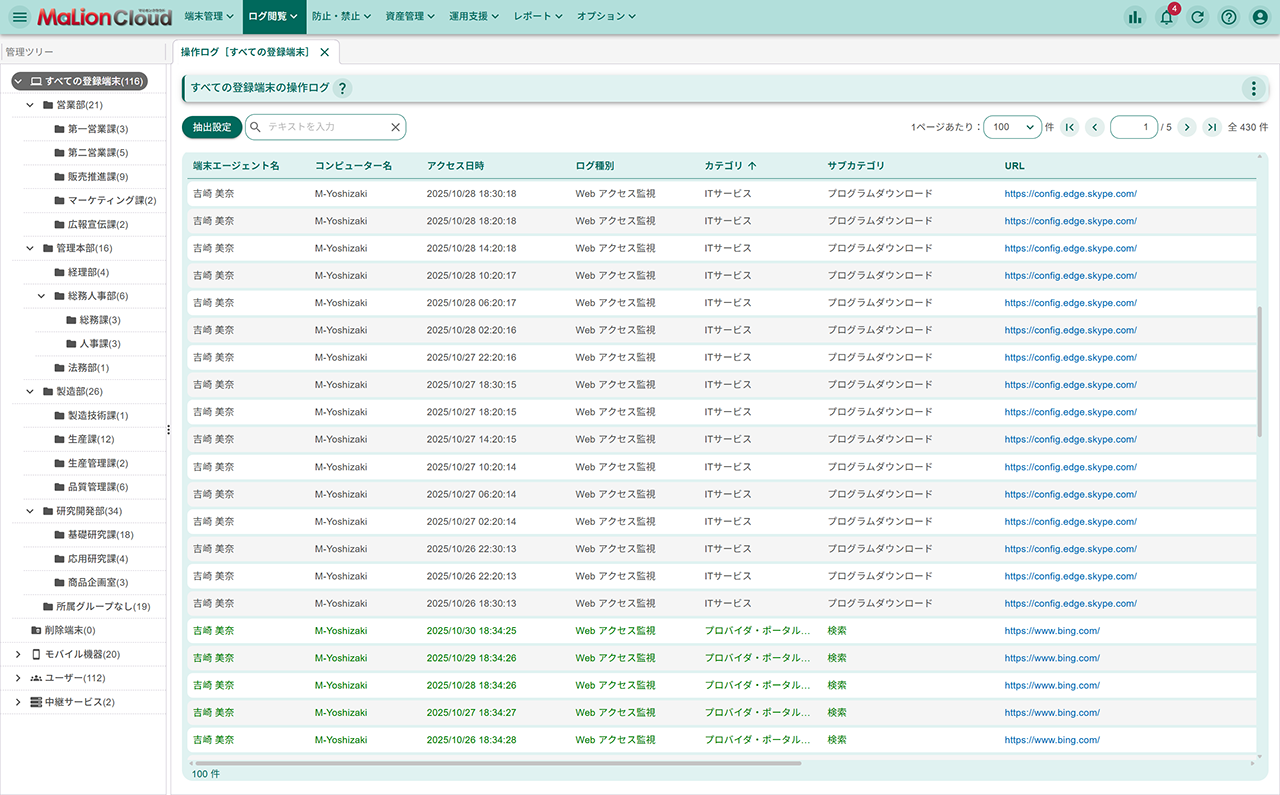 FTPを利用したファイルのアップロードおよびダウンロード情報をログ収集します。特定のFTPアップロードおよびダウンロードを制限することも可能です。