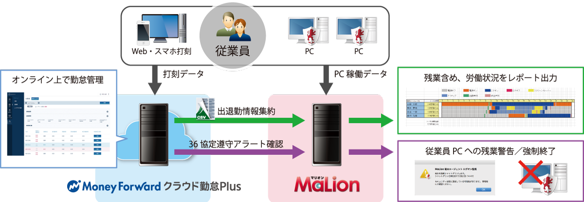 クラウド型勤怠管理システム「マネーフォワード クラウド勤怠Plus」との連携により、組織の労務管理を支援します。具体的には、「マネーフォワード クラウド勤怠Plus」の出退勤情報(打刻データ)を「MaLion」に取り込み、従業員PC別に稼働状況をグラフレポートとして出力します。労働状況・残業状況の可視化、該当従業員への残業警告・PC強制終了など、36協定を遵守した労務管理体制の実現を支援します。