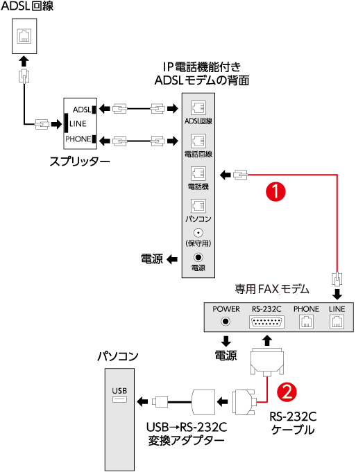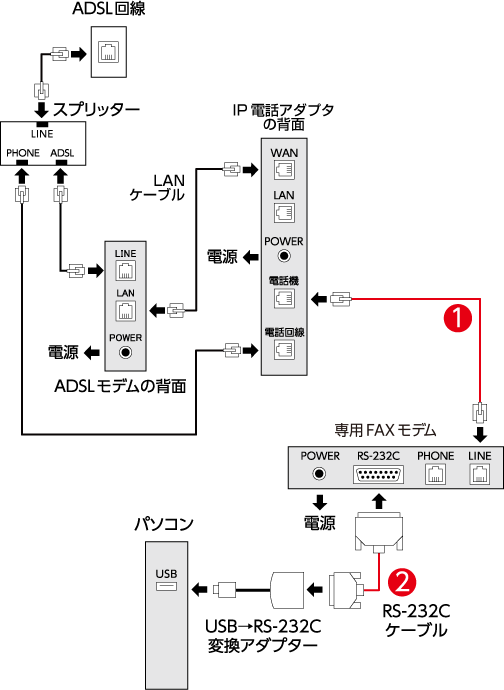 ※図中の黒線、赤線、番号はFAX通信するために必要な配線とその手順です。白線は必要に応じて接続します。