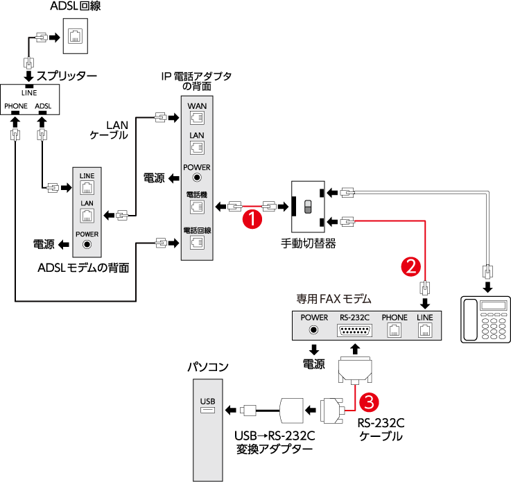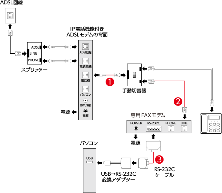 外付けFAXモデム+手動切替器接続例(ADSLモデムとIP電話アダプタが独立の場合)