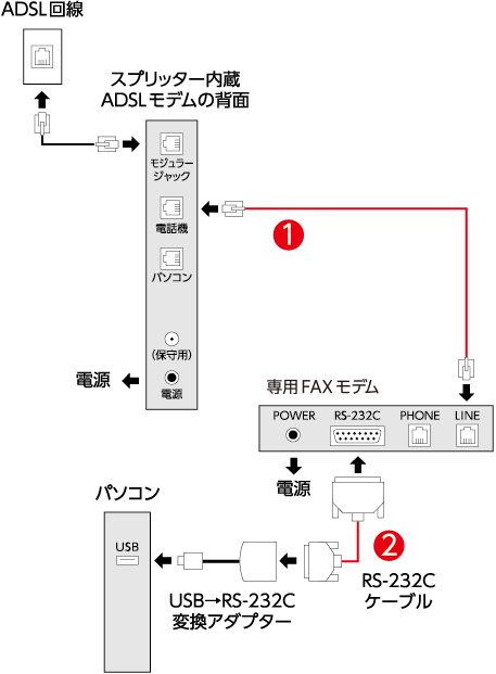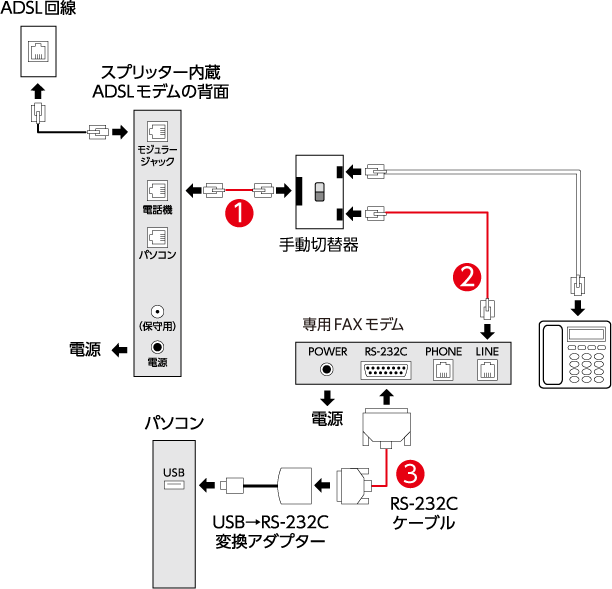 図中の黒線、赤線、番号はFAX通信するために必要な配線とその手順です。白線は必要に応じて接続します。