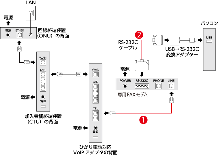 ※図中の黒線、赤線、番号はFAX通信するために必要な配線とその手順です。白線は必要に応じて接続します。