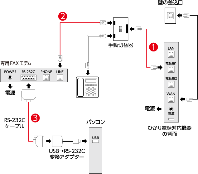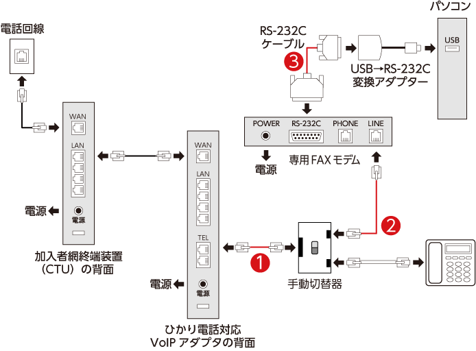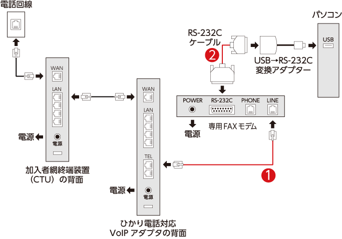 ※図中の黒線、赤線、番号はFAX通信するために必要な配線とその手順です。白線は必要に応じて接続します。