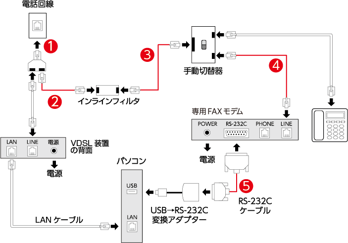 ※図中の黒線、赤線、番号はFAX通信するために必要な配線とその手順です。白線は必要に応じて接続します。