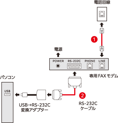 ※図中の黒線、赤線、番号はFAX通信するために必要な配線とその手順です。白線は必要に応じて接続します。