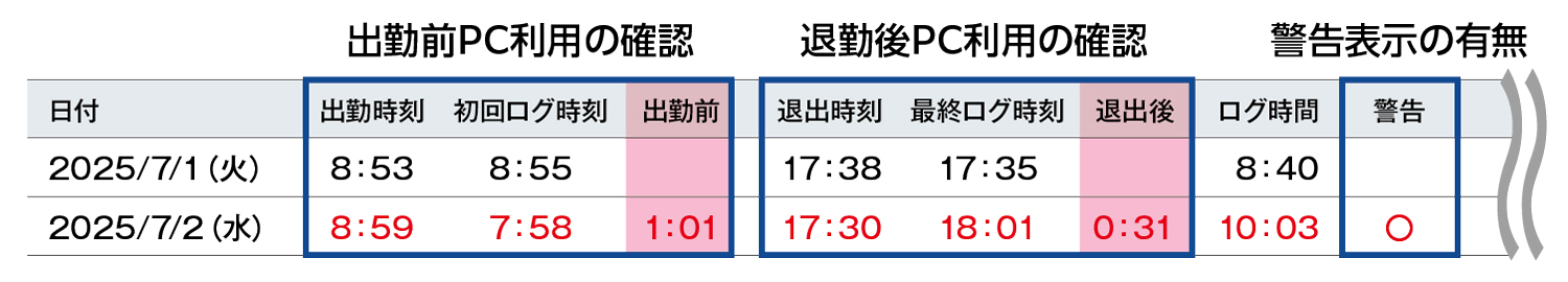 タイムカードの打刻とPCが稼働している実働時間の乖離を可視化して「隠れ残業」を把握 |