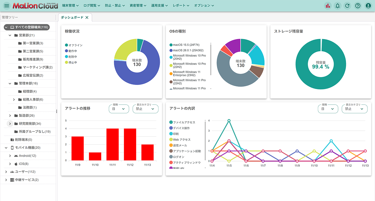 | 報告日報一覧 | クライアントPC管理のために、管理者が日々最低限確認するべき情報のみを抽出して表示 |