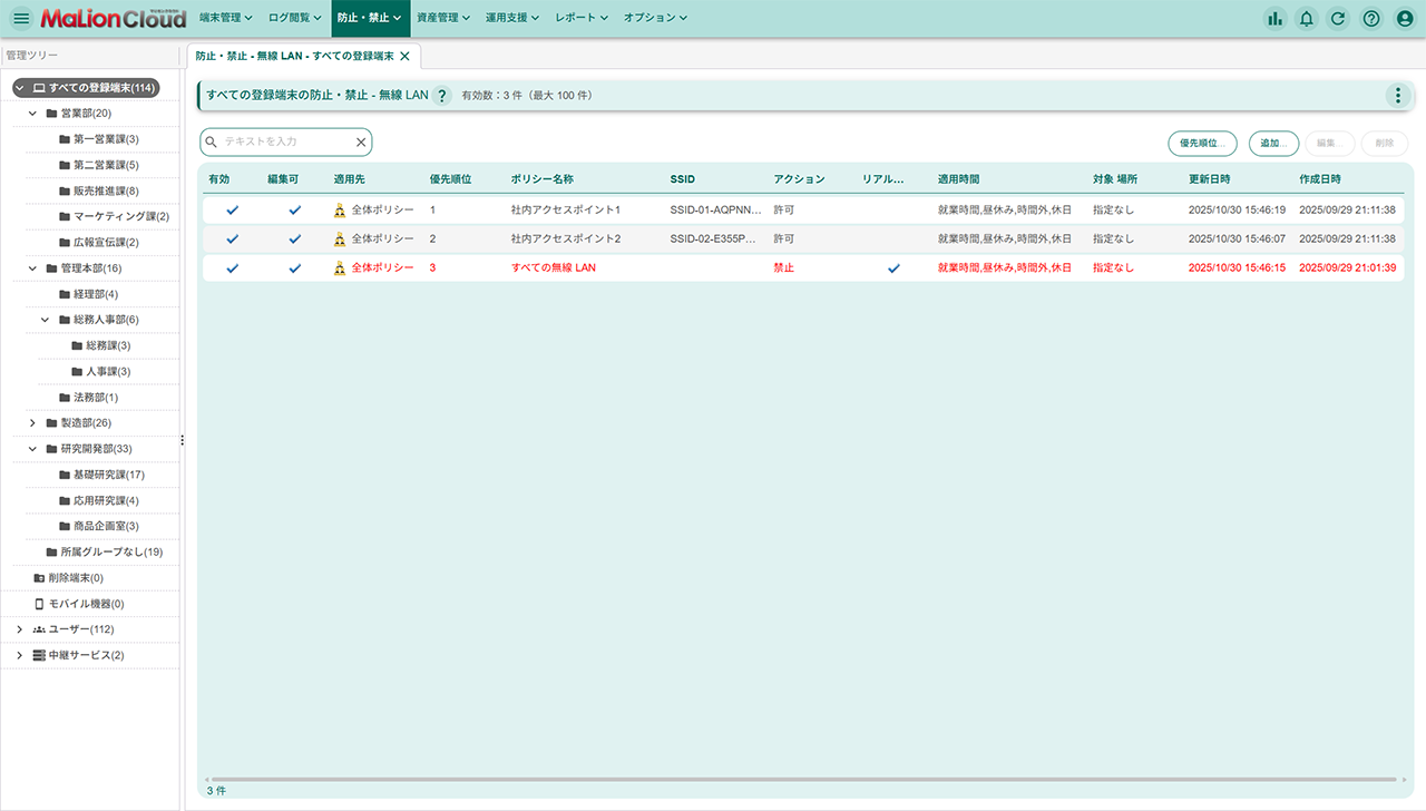 各PCにセキュリティポリシーを設定し、そのポリシーに基づいてクライアントPCの操作を制御できます。これにより、不正操作や情報持ち出しのリスクを未然に防ぎ、組織全体のセキュリティ統制を強化します。