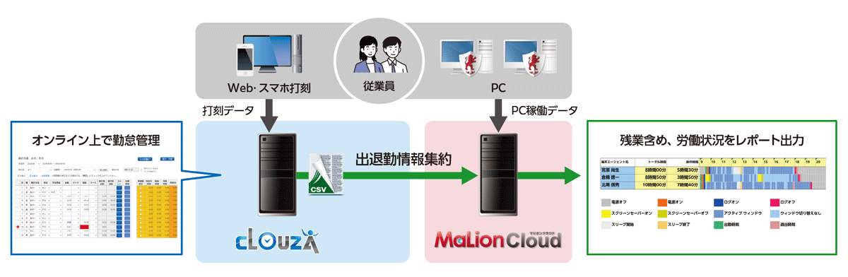 勤怠管理クラウドサービス「CLOUZA」と「MaLionCloud」の連携で、労働時間をより正確に把握できます。例えば、サービス残業の実態は記録上に表れにくく、労働時間の実態を把握することは困難でした。本連携により、従業員の打刻データに基づく労働時間とPC稼働ログに基づく労働時間を比較し、その時間の乖離を可視化できます。退勤打刻後のPC作業を発見し、サービス残業の把握が可能です。また、従業員の行動を目で追えないテレワーク中の勤怠管理としても活用できます。