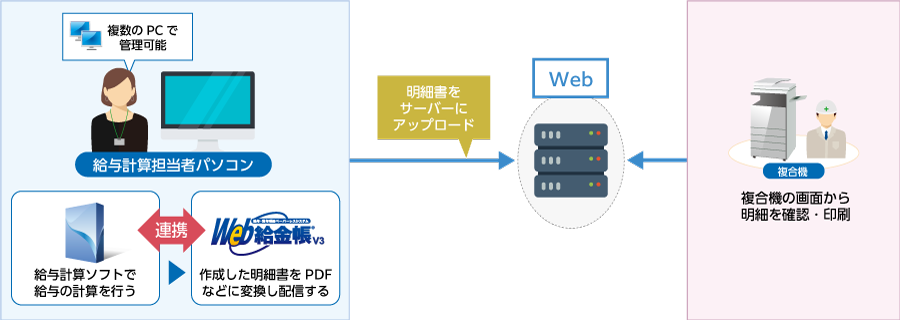24時間体制で業務されている医療関係(病院)や福祉関係や、帰社時間がわかりづらい運輸業など、給与担当者が勤務時間外の社員に直接明細書を手渡しできる機会がなく、支給日に渡せないことがあります。「Web給金帳 V3」を導入すれば、社員が好きな時間に複合機から給与明細を取り出すことができるようになり、スムーズに明細書を配付できるようになります。
